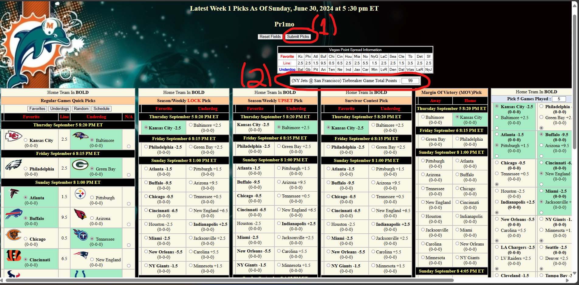 Located just above the weekly games is the tie breaker and must be included to submit your piksheet, the tie breaker is only used for the Low Man Out side game. (tie breaker is the Monday Night Game)